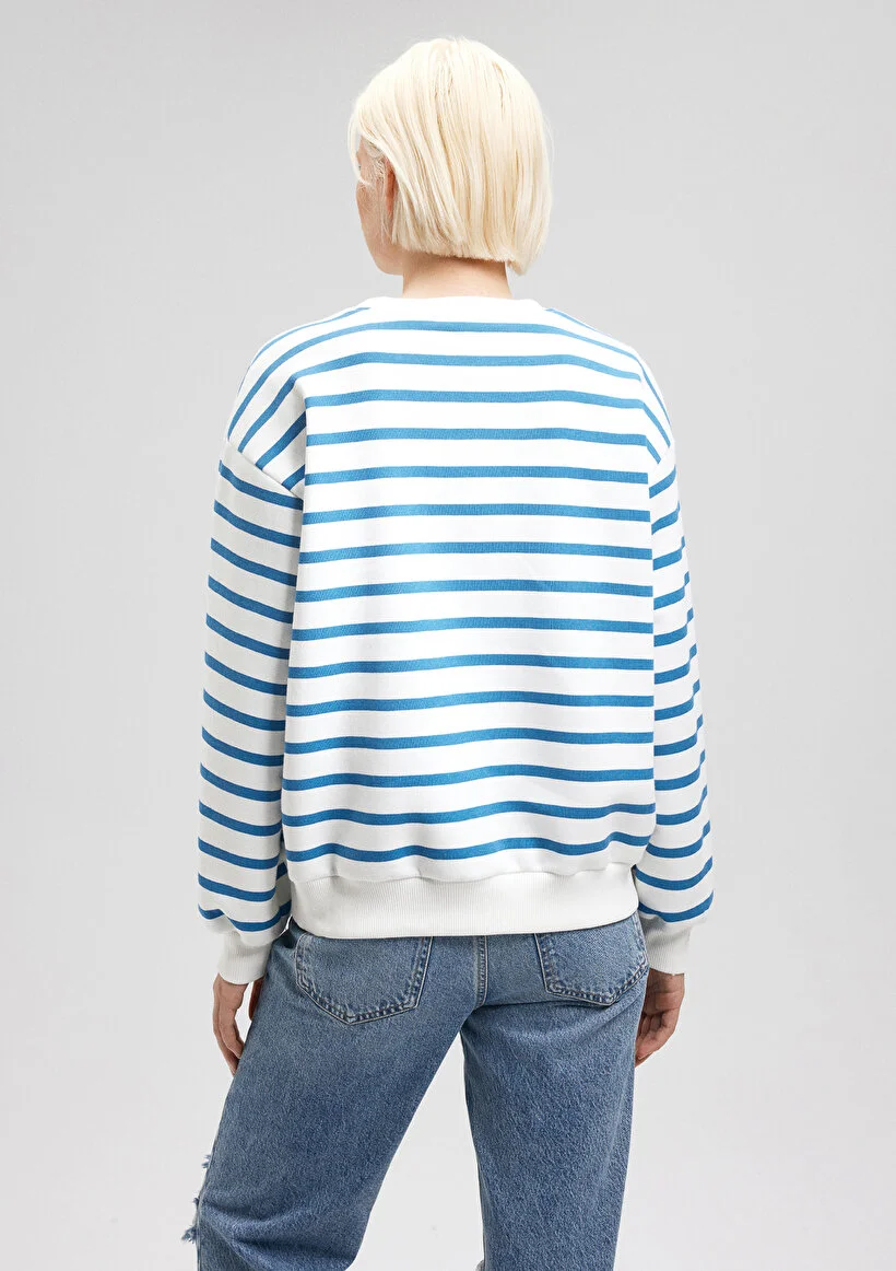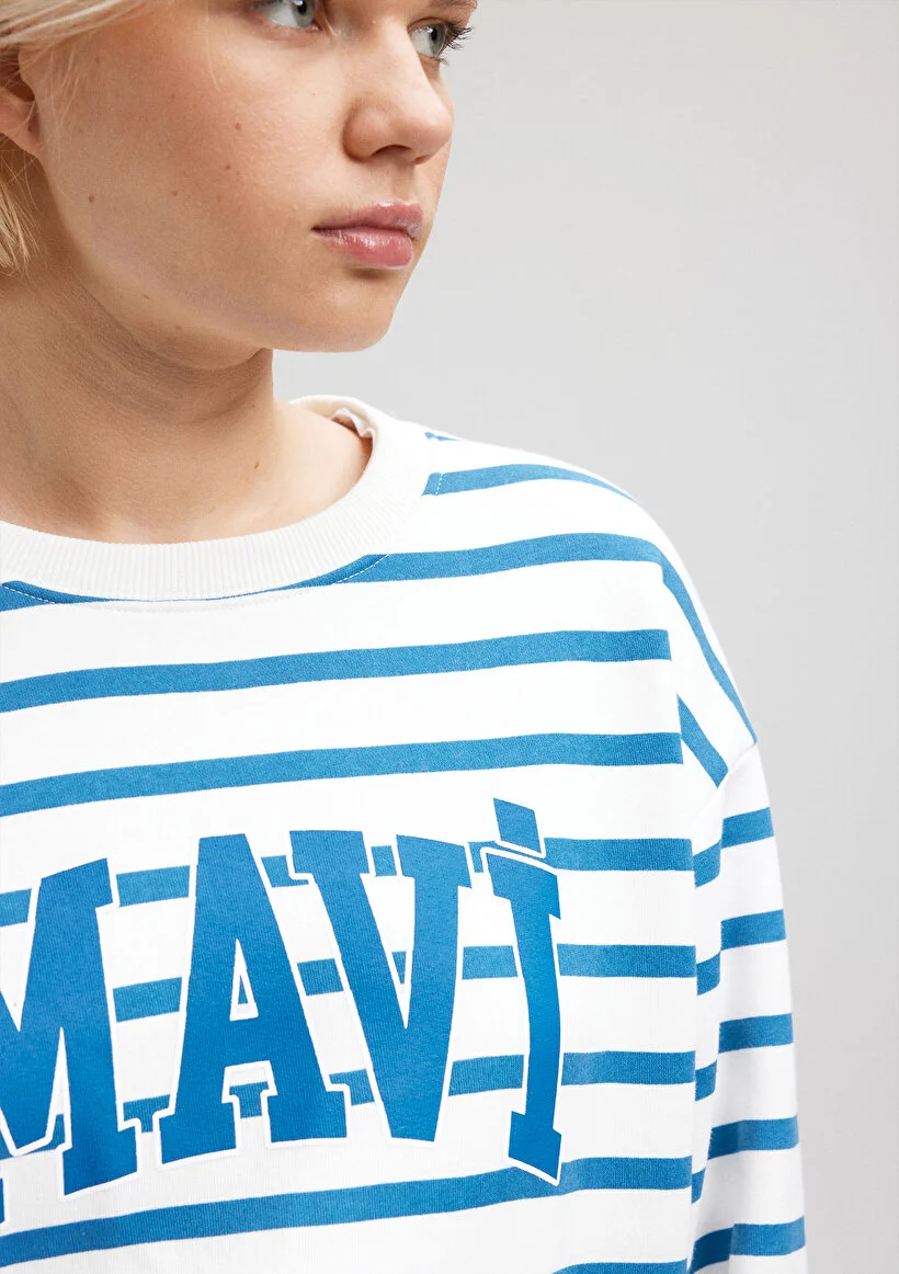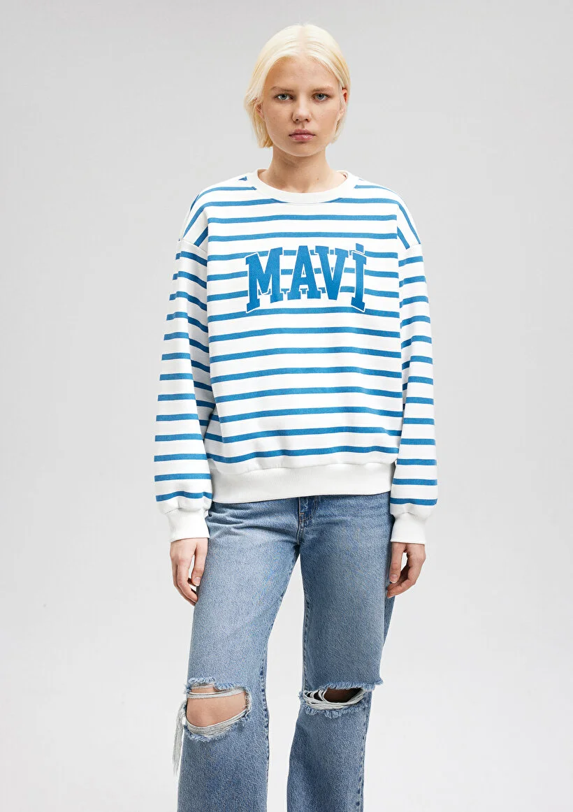 MAVİ LOGO BASKILI MAVİ ÇİZGİLİ SWEATSHIRT, her mevsim giyilebilir kalitededir. Soğuk havalarda sıcacık bir ürün sunan ürün, hafif ve ince yapısı sayesinde yaz aylarında da rahatlıkla giyilebilir.
